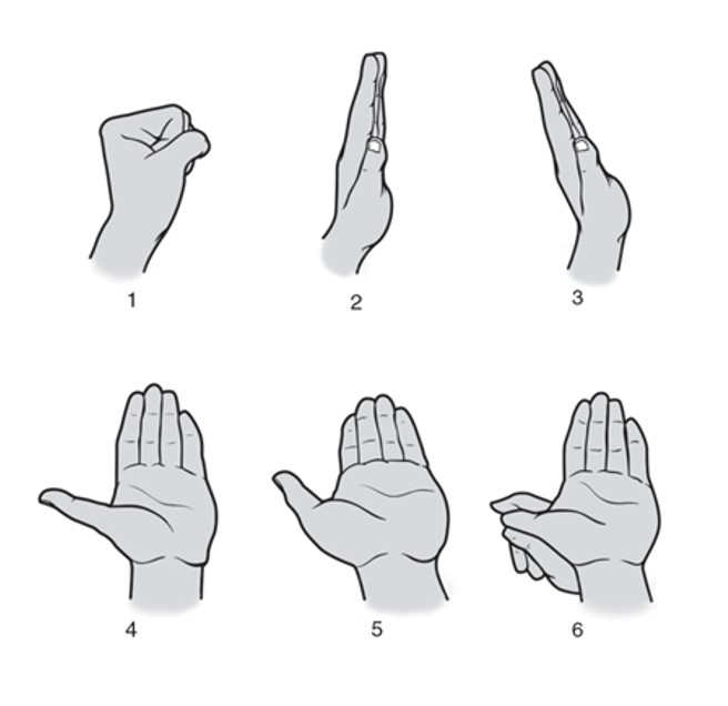 Thẳng cánh tay ra và cổ tay gập mặt lòng, dần cho tới mức tối đa, lúc này sẽ thấy mặt ngoài cẳng tay căng. Giữ tư thế gập tối đa trong 15 giây.