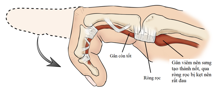 Đau là do bao gân của ngón tay bị viêm, gây sưng, nó kẹt trong ống ròng rọc nên đau buốt